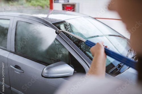 Close up view of woman washing car at car-wash self service station