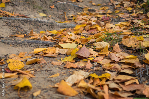 Close up view onto park ground with Autumn yellow, orange & red leaves, mixed with grass & fallen branches