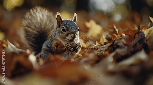 close up wildlife photography shot of squirrel holding acorn amidst autumn leaves, showcasing its playful nature and vibrant fur