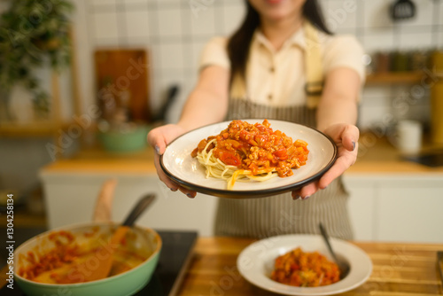 Close up woman proudly holding a plate of homemade spaghetti, ready to be served