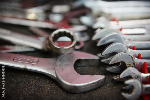 closeup, wrench, absence, auto, repair, shop, colours, image, equipment, fix, row, indoor, group, object, mechanic, nobody, no people, order, part of, series, photo, still life, variety, work, tool
