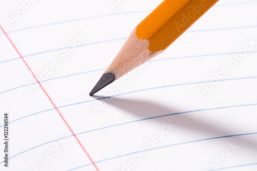 Close up yellow no. 2 pencil on blank composition book college ruled paper