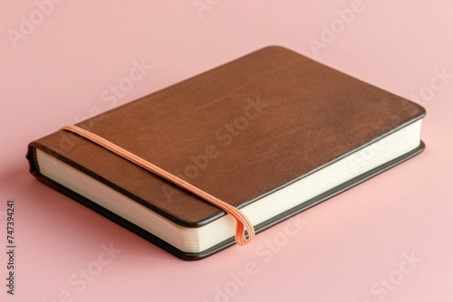 Closed blank notebook with a soft pastel colored cover resting on a pale pink background symbolizing simplicity and calm