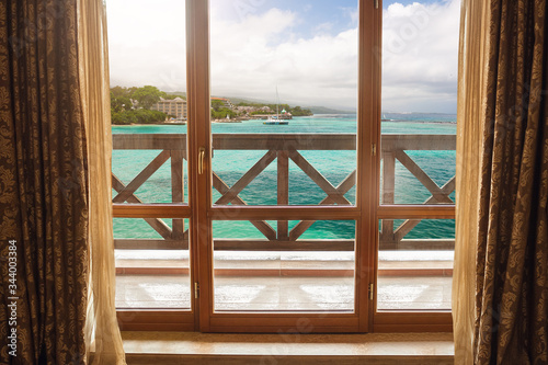Closed window and beautiful picture outside, nature view, resort and resting. Sunny summers or spring day with green grass, sea or ocean, bright and vibrant colors. Tourism, hotels or home mood.