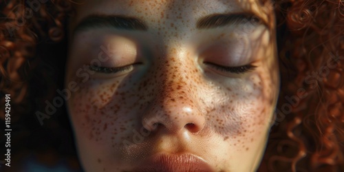 Closest up on a woman's face with her eyes closed in an expression of tranquility or perhaps sleepiness.
