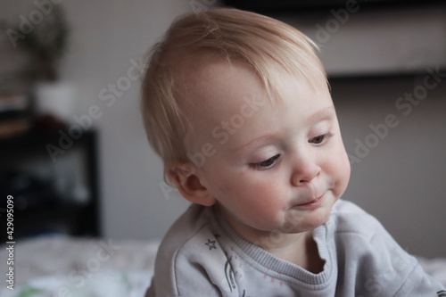 Close-up. A little girl aged one or two years old with a focused business face. Funny children facial expressions. The fair-haired baby is fascinated by something