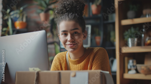 Close-up: Amidst the soft hum of packaging tape, the young woman owner entrepreneur seals a shipping box containing a customer's order, her computer screen displaying a digital rec