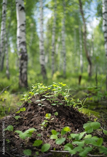 ant, hill, mound, plant, young, green, forest, birch, tree, nature, sunlight, outdoors, ground, dirtied, earth, detail, fresh, vibrant, lush, growing, spring, summer, closeup, sharpened, blurred, background, environment, natural, organic, wild, vegetation, ecosystem, life, growth, texture, damp, soft, daylight, photo