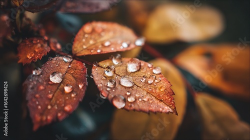 Close-up autumn leaves with dew drops