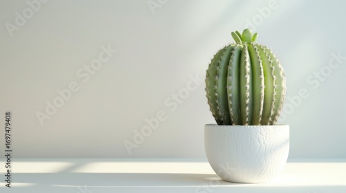 Close-up Barrel Cactus: Green Spherical Plant in White Pot with Light—Minimalist Indoor Bonsai for Home Decor