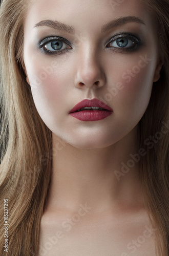 Closeup beauty portrait of young beautiful woman blond girl with long straight hair with natural makeup. Hairstyle and skincare and cosmetics concept