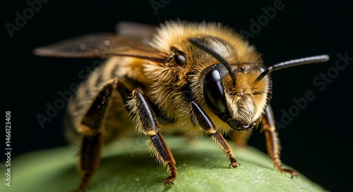 bee, insect, macro, photo, nature, wildlife, closeup, portrait, fauna, zoology, entomology, gold, brown, fuzzy, hairy, leaf, green, plant, detail, texture, eye, antennae, leg, wing, body, art, image, photo, picture, still life, natural, organic, stock, commercial, amazing, beautiful, stunning, vibrant, intricate, detailed, quality