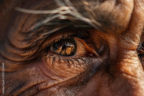 Close-up captures an elderly eye, reflecting life's journey with striking detail, wrinkles and intense focus. It conveys wisdom and experience.