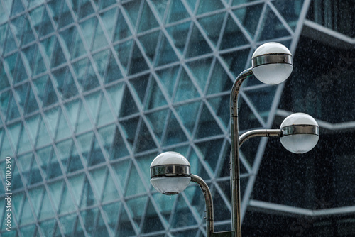 Close-up contemporary urban design elements. Three white globe shaped streetlights in rain sit on curved metal arms of varying heights against backdrop of geometric patterned glass architecture.
