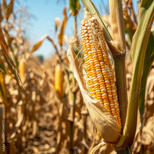 Close-up corn cobs in corn plantation field.