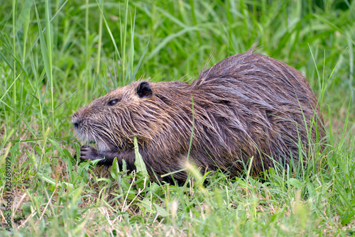 Closeup coypu (Myocastor coypus) in grass seen from profile near the ponds of Camargue in France
