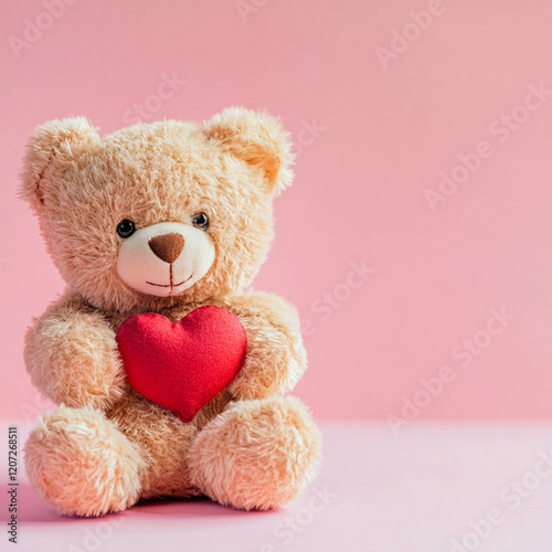 close-up cute toy teddy bear holding red heart on pink background with copy space