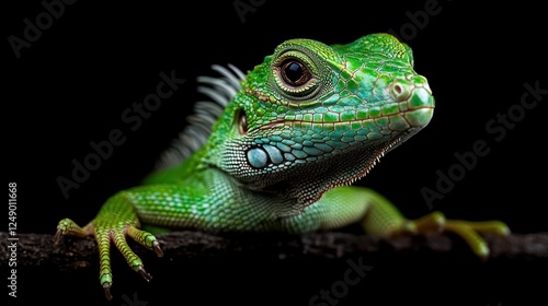 lizzard, reptile, green, iguana, wildlife, animal, nature, closeup, studio, macro, exotic, photo, scale, fauna, vertebrate, reptile, tropical, emerald, portrait, photo, animal, closeup, background, black, dark, tree branch, closeup