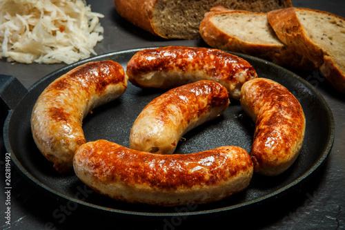 closeup, 5, appetising, ruddy, juicy, sausage, fried, large, frying, pan, served, sliced, rye, bread, homemade, sauerkraut, black, background, food, cooking, frankfurter, wiener, grill, meat, delicious, meal, tasty, cooked, roasted, cookery, fresh, bar-b-q, beef, bratwurst, dinner, fast, lunch, pork meat, snack, epicure, cookware, preparation, kitchen, product