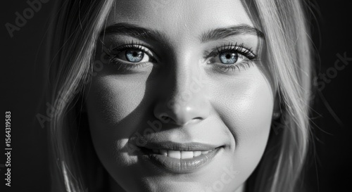 woman, face, portrait, greyscale, eye, smile, closeup, beauty, person, beautiful, photo, image, black, white, blond, hair, happy, attractive, confident, charming, expression, feature, emotion, detail, light, shadow, glamour, modern, style, elegant, fashion, glamourous, model, portraiture, photo, pretty, lip, nose, skin, gorgeous, facial, art