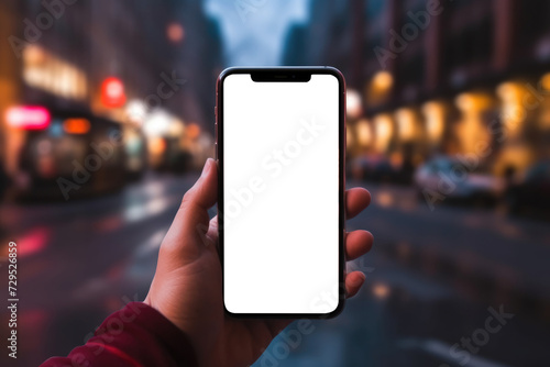 closeup hand displaying a smartphone with blank screen mockup against a backdrop of blurred city lights, creating an alluring urban atmosphere