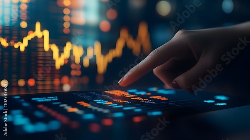 Close-up Hand Pointing at Detailed Financial Data on Business Table with Market Background