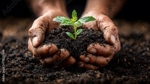 Close-up, heartfelt photograph of hands gently cupping rich soil, nurturing a tiny, vibrant green seedling that represents new growth and environmental care.