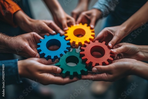 Close-up illustration of a team of business people holding vibrant gears, highlighting the concept of working together and mutual cooperation in a professional setting.