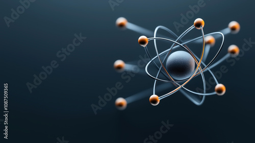 Close-up illustration of an atom model with nucleus and orbiting electrons on a dark blue background, representing atomic structure and scientific concepts.