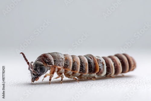 Close-up image of a beetle larva with detailed texture against white backdrop