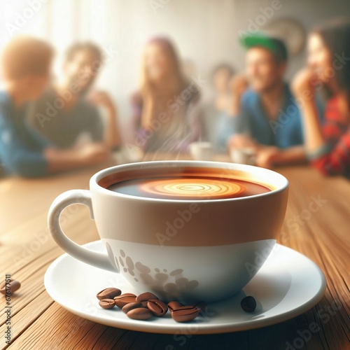 Closeup image of a coffee cup in a cafe. Happy friends drinking coffee. Mug of steaming coffee. Gathering. Advertising for coffee. Commercial. Bokeh background. Generative AI
