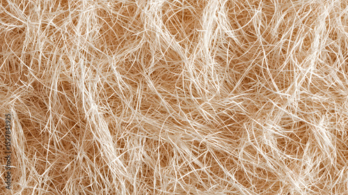 Close-up image of a natural fibrous texture with intertwined light and dark strands, resembling dried plant fibers or straw.
