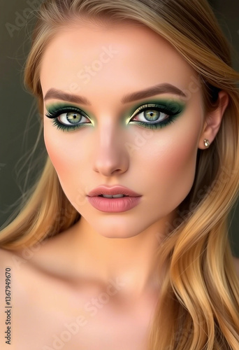 Close-up image of a woman displaying bold green eye makeup, soft pink lips, styled blonde hair, and captivating blue eyes. Perfect for beauty, fashion, and cosmetics themes or editorial projects.