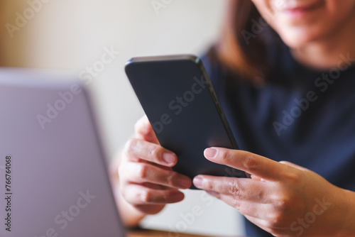 Closeup image of a young woman using smart phone and laptop computer