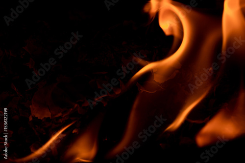 Close-up image of bright orange flames against a backdrop of black ash and burnt debris. A strong visual composition depicting the power, energy, and beauty of nature in the form of the fire element.