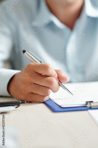 Close-up image of businessman sitting at office table and analyzing line chart on clipboard
