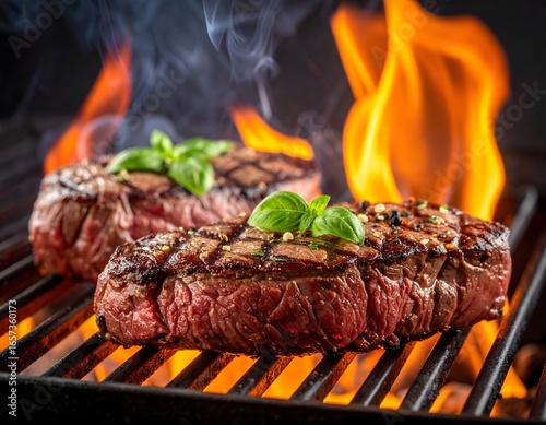 Close-up juicy beef steak sizzling on hot grill with flames and smoke – delicious barbecue cooking concept.