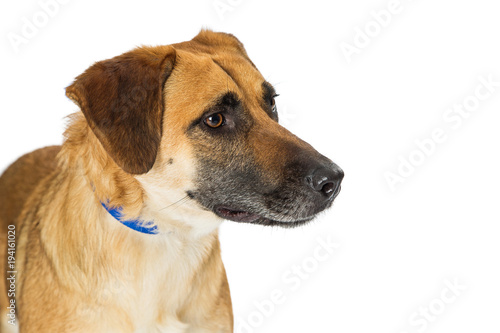 dog, pet, animal, canino, white background, isolated, studio shot, cut-out, head shot, portrait, closeup, face, copy space, blue