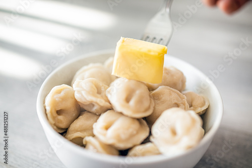 Closeup macro of traditional Russian dumplings pelmeni with meat filling stuffing in white bowl with hand fork placing butter on hot food in traditional recipe