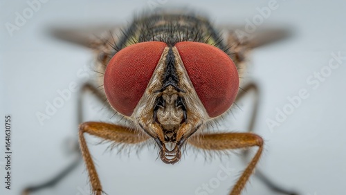 Close-up macro photography of a typical housefly highlighting its prominent red eyes.