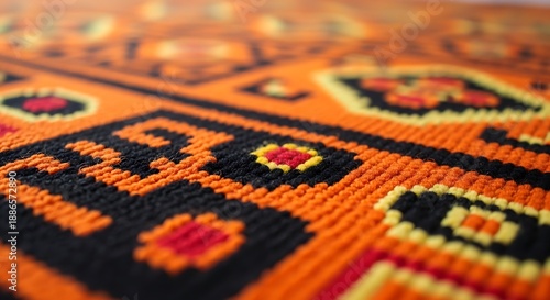 Close-up macro shot of an authentic orange woven textile with intricate black and red geometric patterns