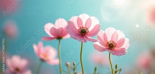 Close-up macro view of soft pink cosmos flowers blooming in sunlight against bright turquoise sky. Delicate petals, green centers, slender stems create serene, natural background ideal for beauty