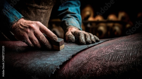craftsman, leather, bag, polishing, closeup, medium, shot, shine, enhancement, textured, workspace, out, sharpened, artisan, craftsmanship, attention, detail, tool, creative, process, hand-made, quality, skill, artistry, environment, workbench, surface, material, lighting, demonstration, dedication, good, visual, texture, macro, professional, trade, industry, hand, work