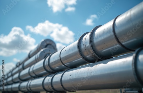 Close-up metal pipelines against blue sky with white clouds. Industry technology for gas, oil, hydrogen transport. Energy sector infrastructure for supply, construction, production. Fuel industrial