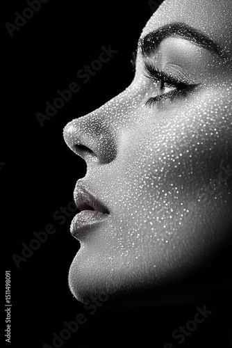 woman, face, profile, closeup, monochrome, black, and, white, sparkle, glistering, texture, skin, dramatic, lighting, portrait, beauty, elegant, serene, calm, photographic, still, life, artistic, fine, art, high, contrast, shadow, light, grain, particle, detail, expression, intense, sharpened, sharp, clear, dark, background, model, fashion, photo, studio, aesthetic, visual, graphic, image, picture, photo