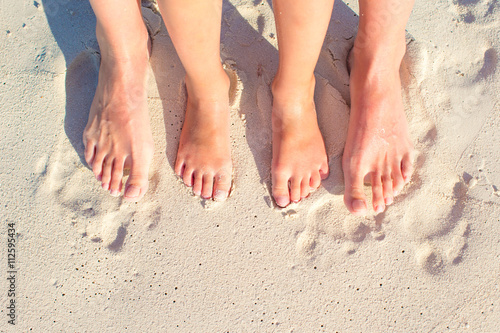 Closeup mother and kid feet on white sand beach