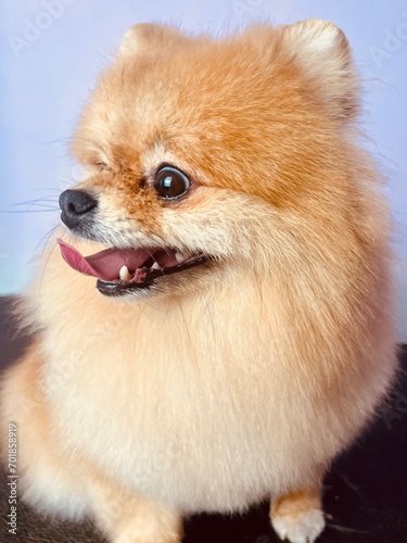 close-up muzzle of a red Pomeranian Spitz with an open mouth and protruding tongue and dark eyes looking to the side on a light purple background. cute pet