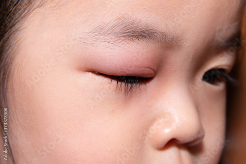 Close-up of a Asian child eye stye. Ophthalmic hordeolum disease. Selective focus.