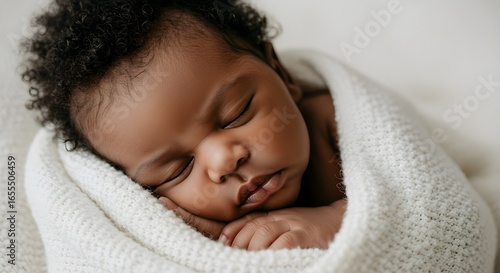 Close-up of a baby sleeping peacefully wrapped in a soft blanket, capturing innocence, tenderness, love, and warmth.