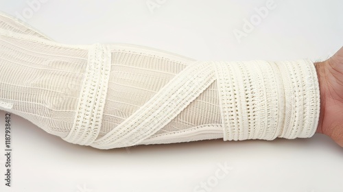 Close-up of a bandaged elbow with a medical brace on a clean white surface, symbolizing recovery, care, and medical treatment. Injury healing concept.